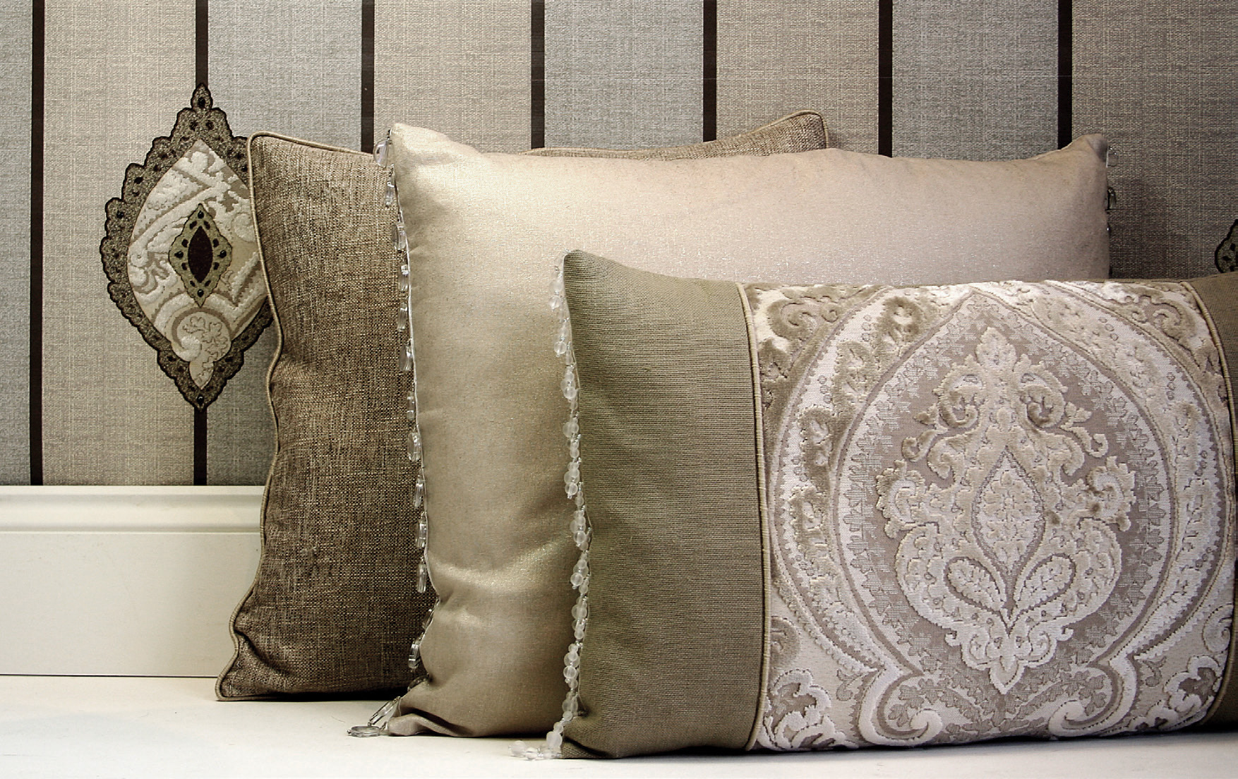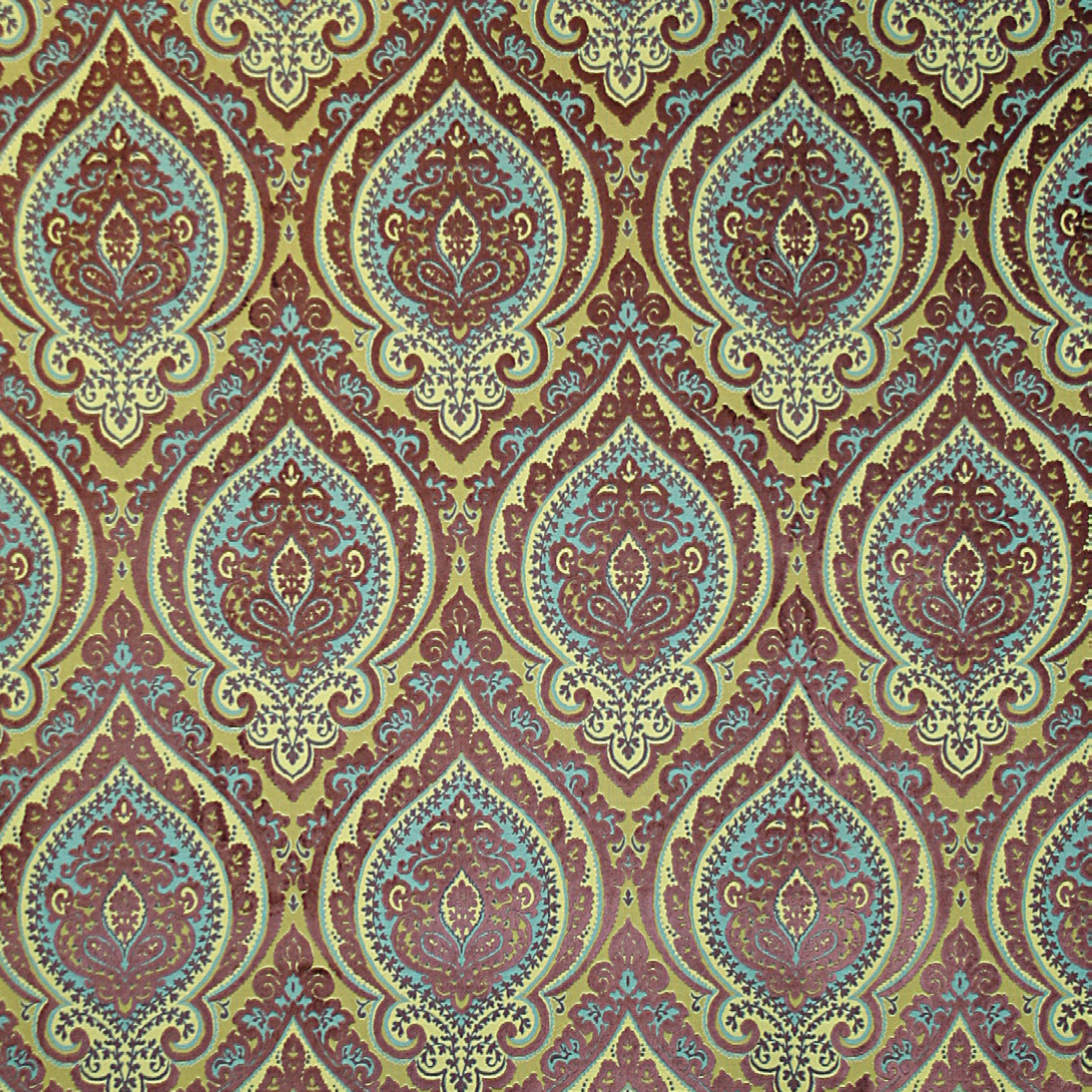 A touch of Eastern promise with a contemporary and sophisticated sense, offering a fashionable colour palette showing variation shades of green, purple, brown and grey. The first of its kind, appliqué wallpaper with matching chenille upholstery fabric and luxurious mix and match accessories.