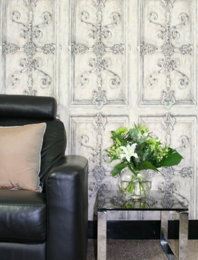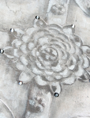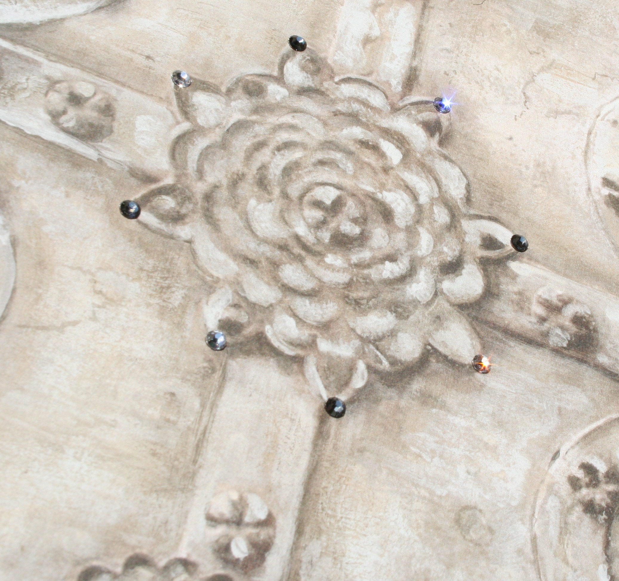 IRON SCROLL a masculine and unrefined style. An exciting hand painted impression by our in-house designers, of a weathered Iron wall panel, dating back to the 1800’s with the application of classical scrolls, fleur de lys style patterns and floral designs. Also available with a delicate cluster of diamond black and Silver SWAROVSKI ELEMENTS.