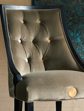 A distressed and modern design influenced to create a textural, antique look with an ingenious version of Verdigris, which is a bright blue-green patina that forms on brass or copper caused by atmospheric oxidation. This fabric has a natural consistency of polyester, nylon and cotton in the weave and the pattern is highlighted with hints of black and gold yarn. This fabric is available with Swarovski® crystals and can be laminated for textile panelling as shown in image.