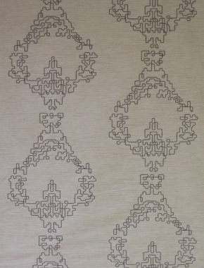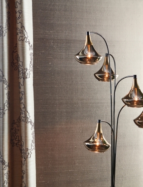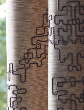 An elegant and radiant damask trail has been created using a special embroidery technique known as couching. This is where coils of cords are over-sewn with a fine thread to create a three-dimensional effect. Cornelli presents a classical damask design in electronic format on a woven striped background with tonal variations of beige offering a sleek contemporary finish. This fabric is also available as a textile panelling as shown in image.
