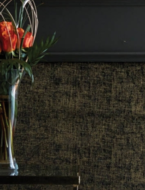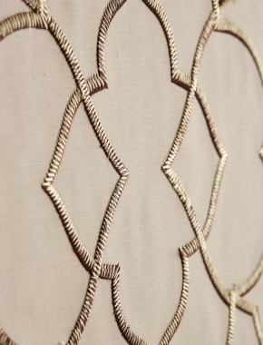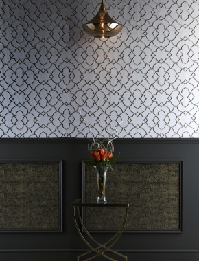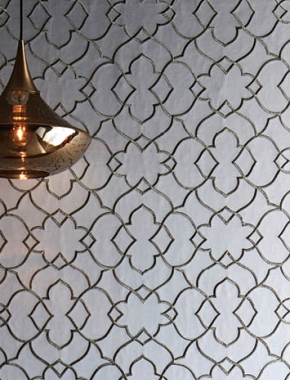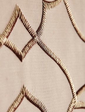 Inspired by a lotus flower this fusion of contemporary and vintage décor presents sheer opulence and beauty. An exquisite overlay pattern of the lotus leaf is mirrored and intertwined to create an all-over continual design. This fabric offers a smooth satin finish base with a heavy stitch embroidery layered with fine metallic gold thread to give a three-dimensional look. This fabric is available as a textile panelling as shown in image.