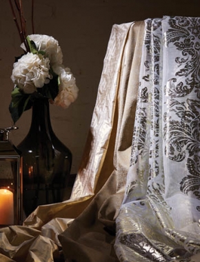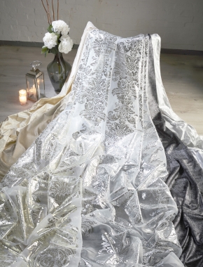 Enchantingly opulent selection of favourable gold and silver metallic hues bringing a textural delight of velvets, silks and sheer organza fabrics to life. This glorious fusion of finishes offer a beautiful array of glistening and sophisticated surfaces which is suitable for a traditional or contemporary interior. These fabrics are available with Swarovski® crystals and can be treated with stain and water repellent for bathrooms.
