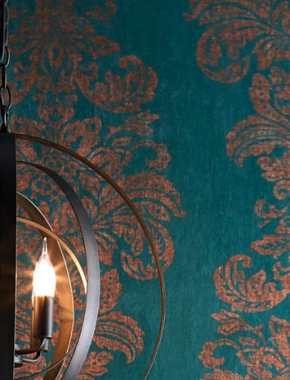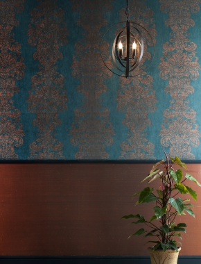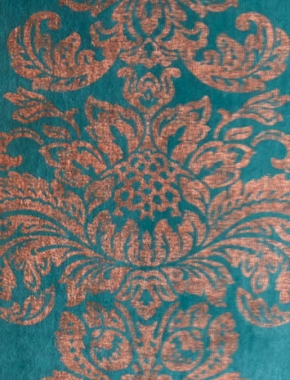 A vibrant and decorative damask design, stunningly hand screen printed with antique metallic ink. The smooth crushed dyed velvet surface creates an elaborate vintage and weathered look. This fabric is inherently fire retardant and available with Swarovski® crystals. Bespoke colourways are available on request and can be laminated for textile wallcoverings.