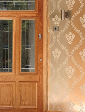 The third colourway has a unique soft focus antique mirror appearance. A classic look from the 18th century guilded glass fixed with gold crystals giving that exclusive shimmered glassed effect. To further this look there are two beautiful silk printed fabrics to co-ordinate.