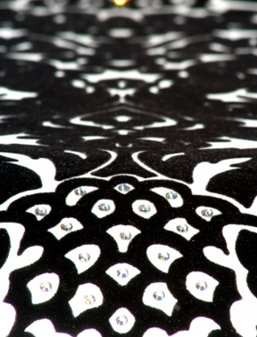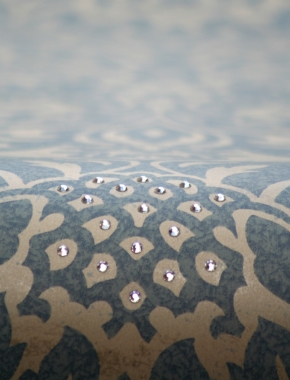 JEWELED DAMASK As the name suggests jeweled damask is a damask with a difference. The large design dazzles and shimmers the lavish crystals bouncing light from candles and lamps. A breathtaking combination of six superior colourways. To further enchnace the already luxurious mood there is a assortment of ten beautiful handwoven silks to match lovingly known as design no: 1365